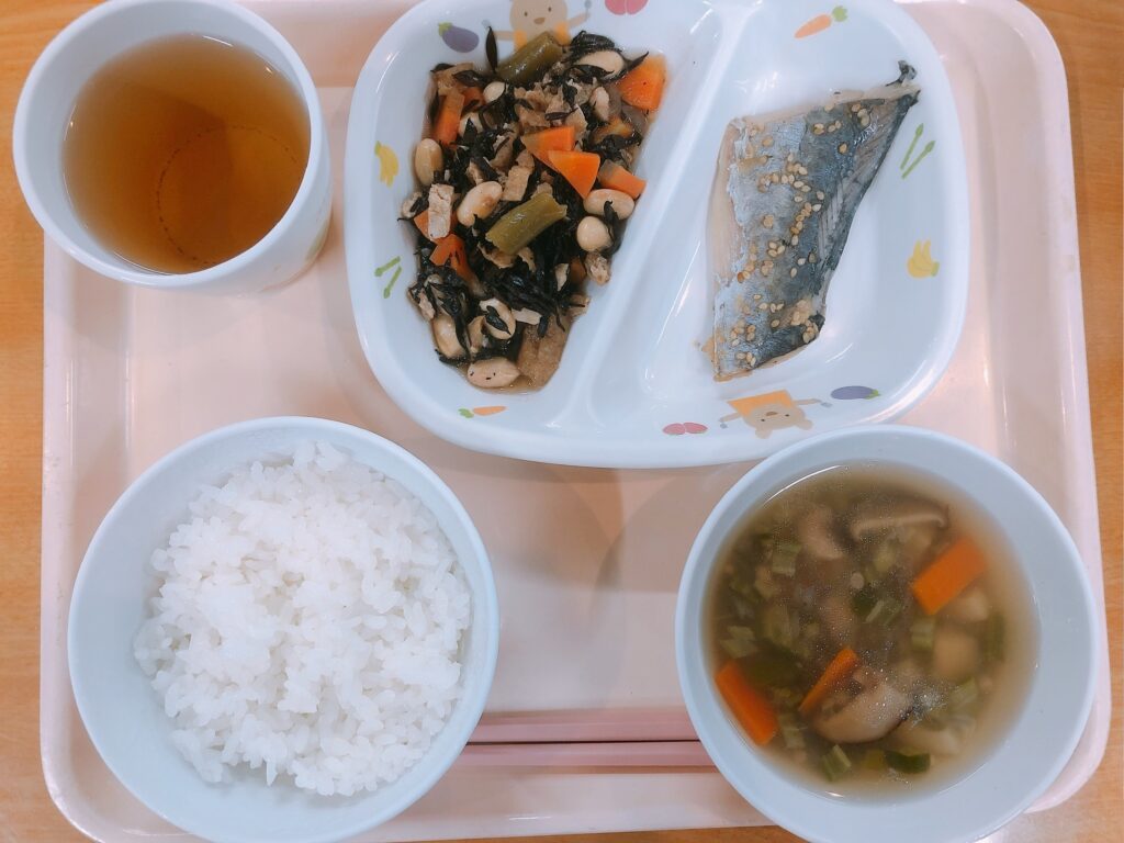 ご飯、さわらのごま味噌焼、大豆とひじきの煮物、のっぺい汁