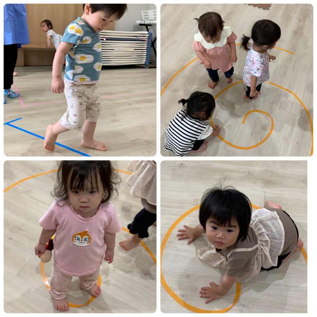 星組さんは、様々なテープの道の上を先生と一緒に歩いて遊びました∩^ω^∩