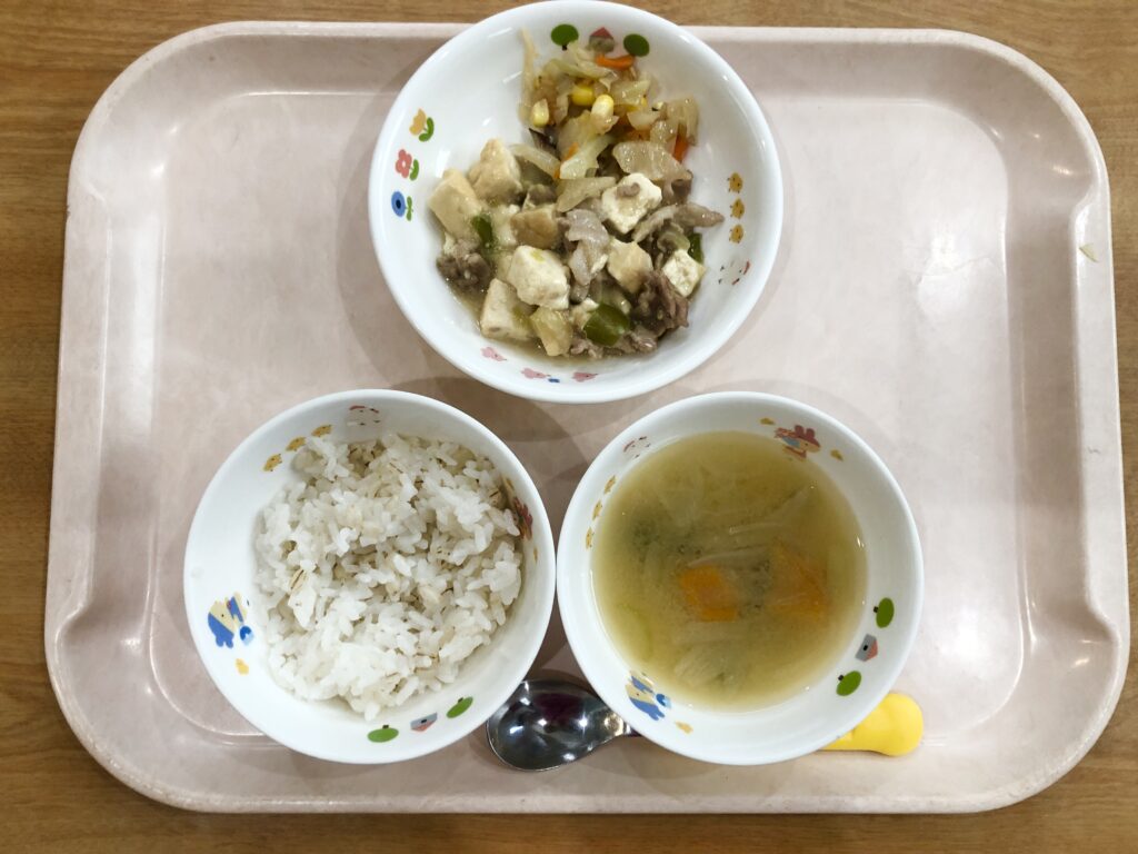 麦ごはん、みそ汁、厚揚げの中華煮、梅ドレッシングサラダ
