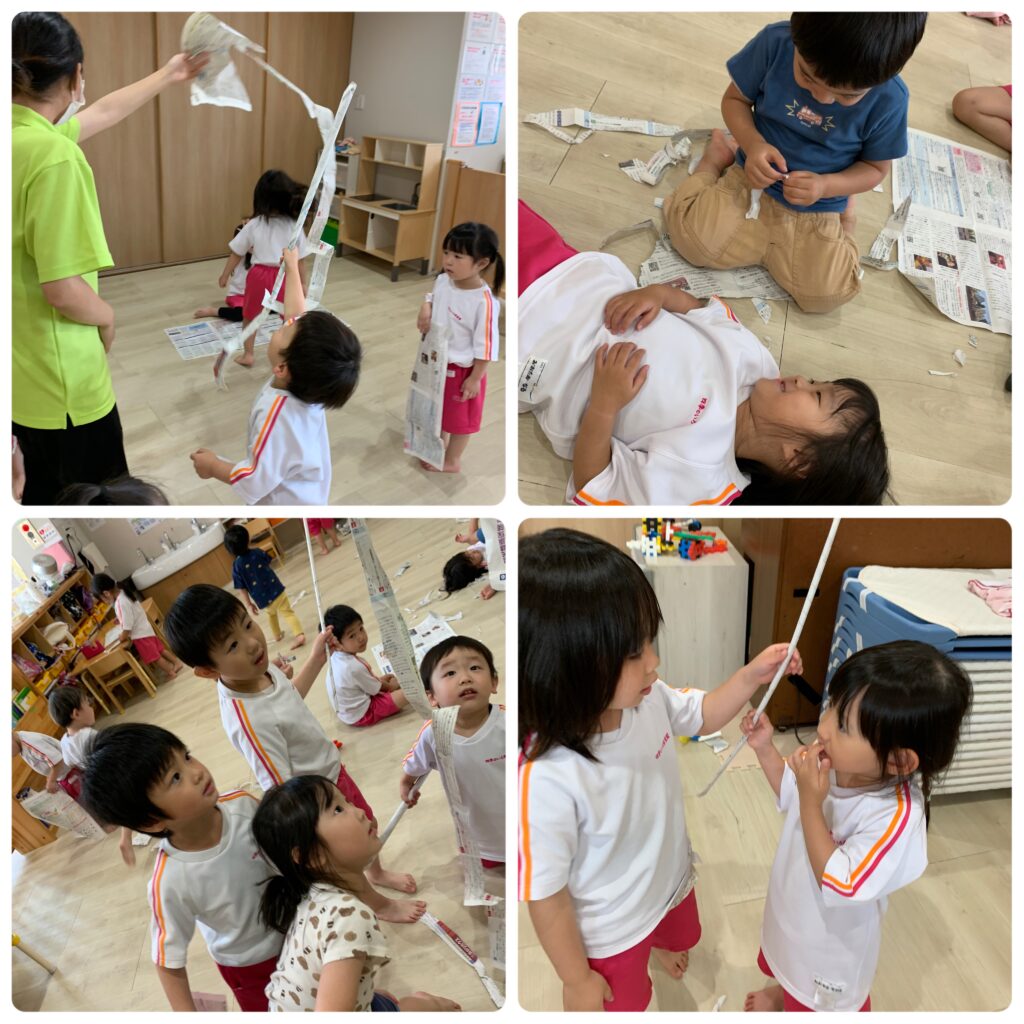 ビリビリ破いたり、剣を作ったりそれぞれ工夫しながら好きにあそんでいましたよ。
