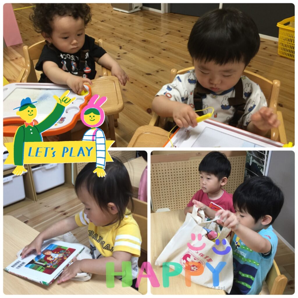 磁石で線が描けるおもちゃを渡すと興味深々、真剣な顔でペンで線を書いたり、手で触ってみたりして遊んでいましたよ。