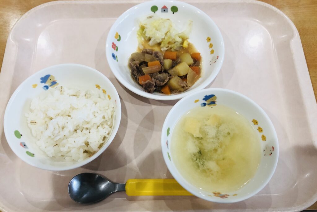 むぎごはん、みそ汁、肉じゃが、キャベツとコーンサラダ