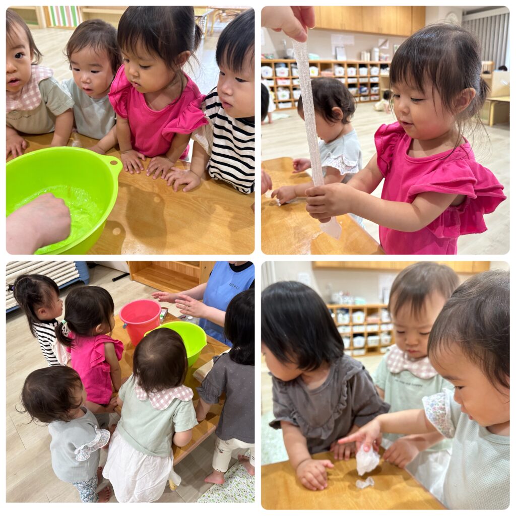 ぺたぺた、びよーんと伸びる不思議な感触に興味津々です!