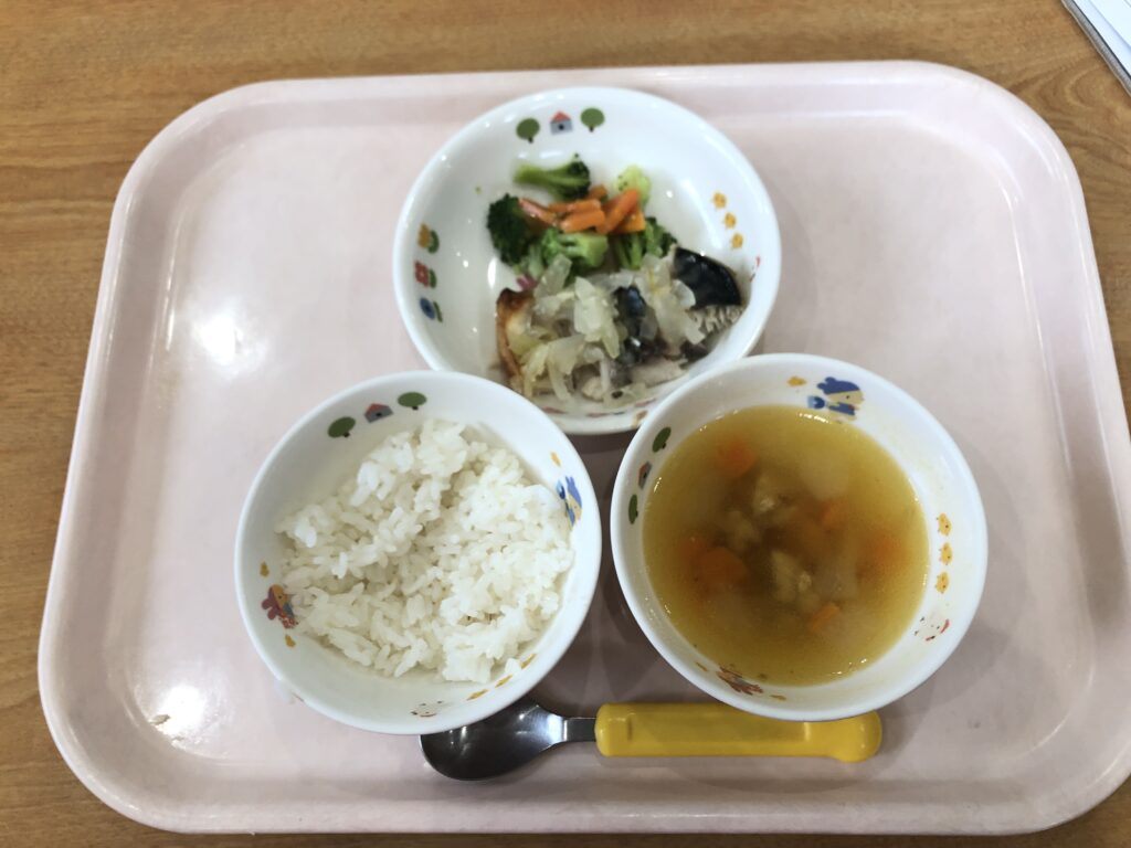 麦ごはん、とうがんのそぼろ汁、さばと玉ねぎのみそ煮、ブロッコリーのサラダ