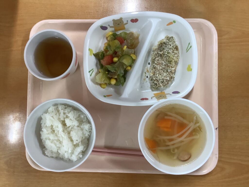 ご飯、鶏肉の香草焼き、レタスとトマトの和風サラダ、もやしとウインナーのコンソメスープ