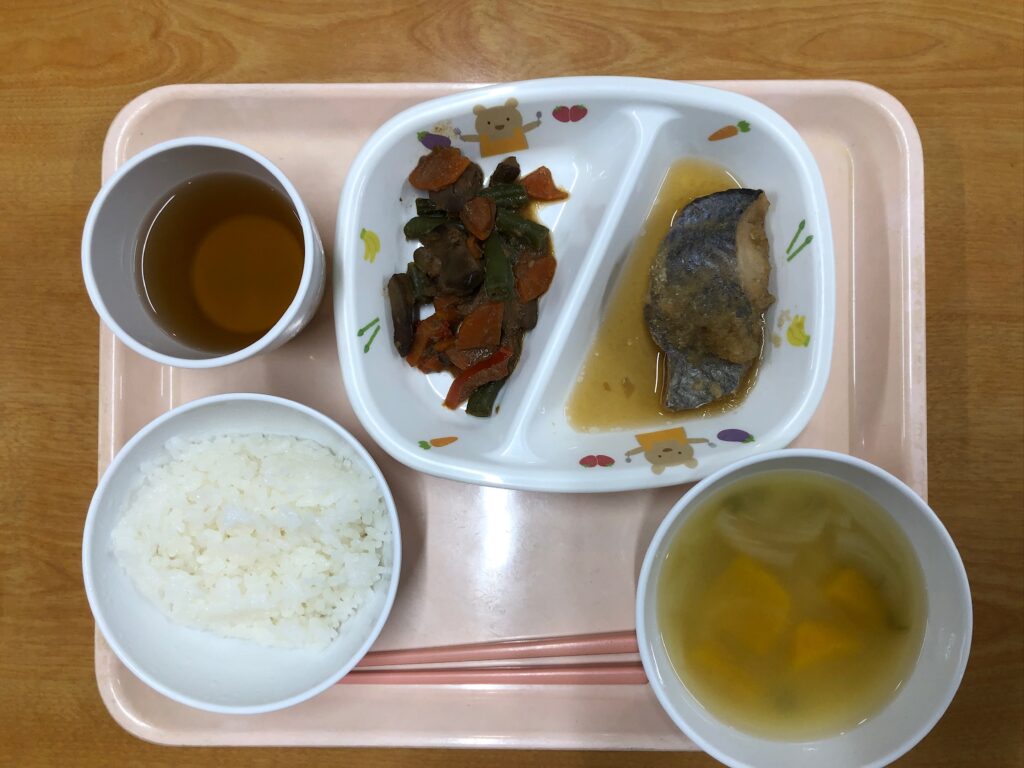 ご飯、ホキのおろし煮、レバーの甘辛炒め、かぼちゃの味噌汁