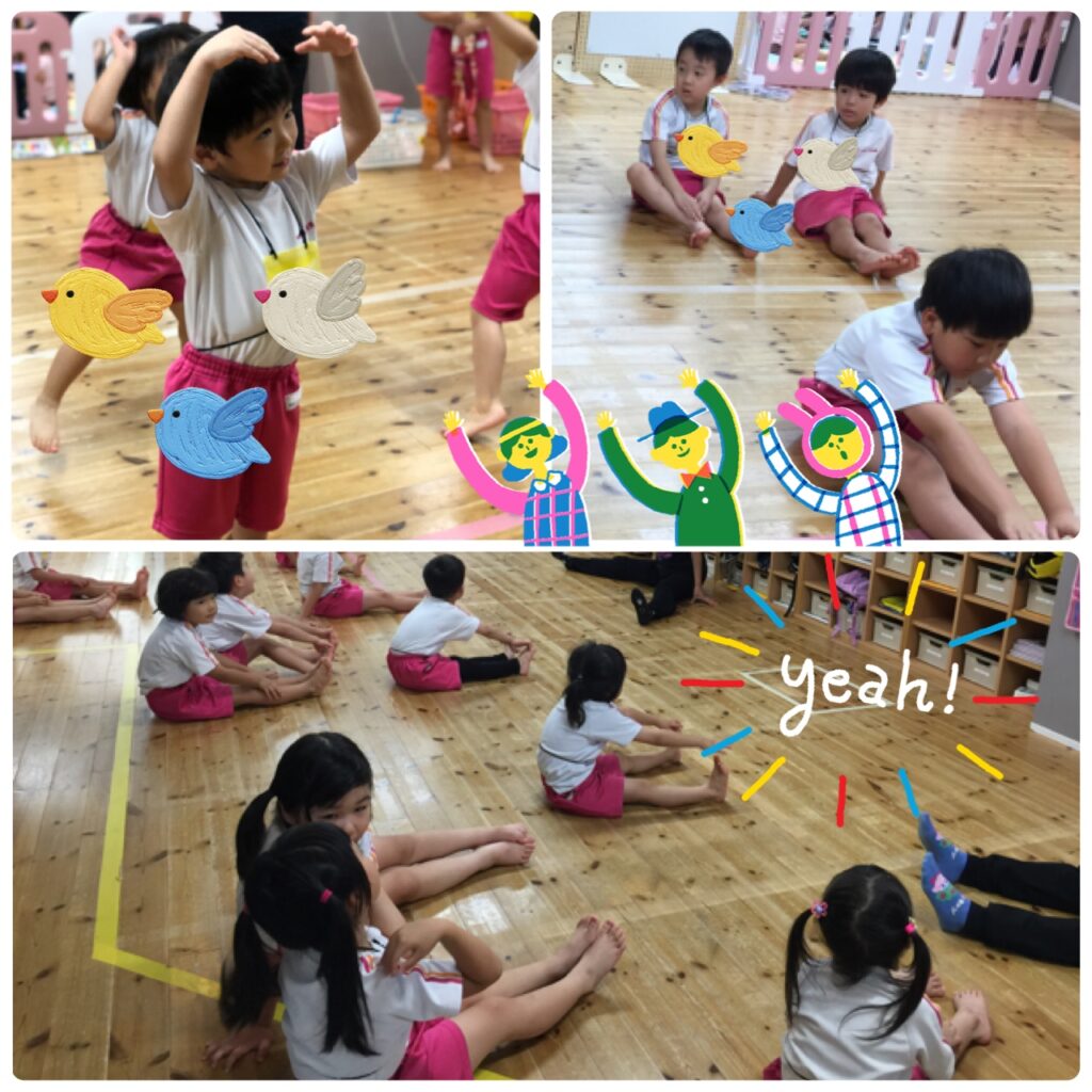 先生と一緒に足を曲げたり伸ばしたり、準備運動も元気いっぱい取り組むことができましたね。