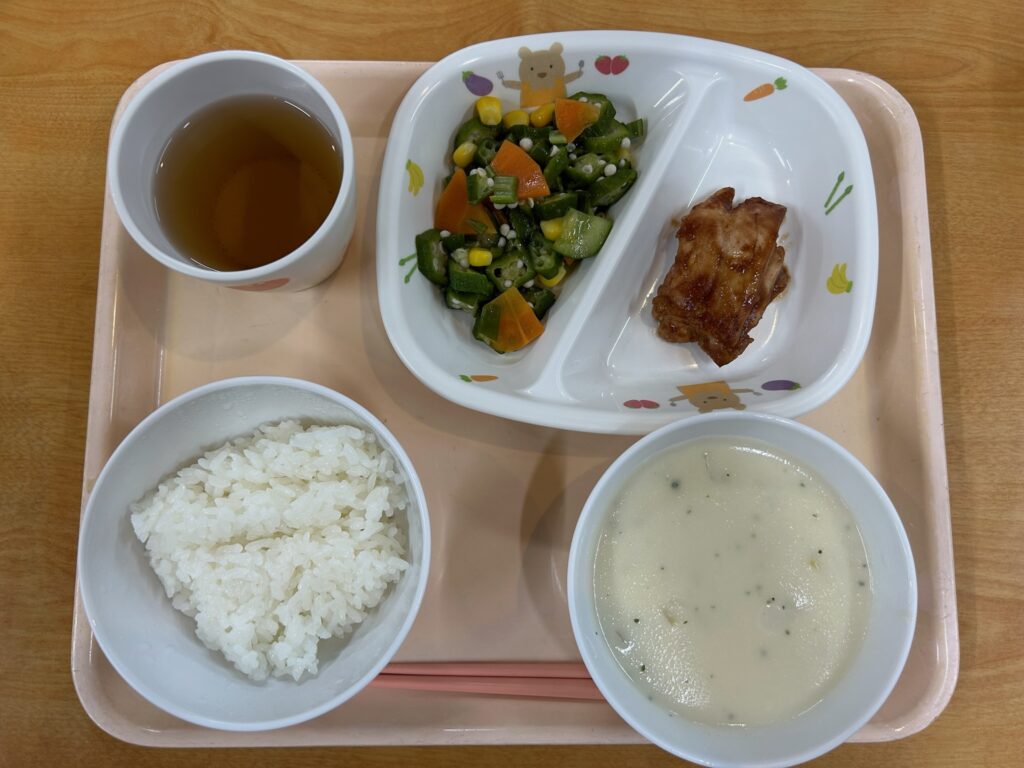 ご飯、バーベキューチキン、オクラの和風サラダ、ポタージュスープ