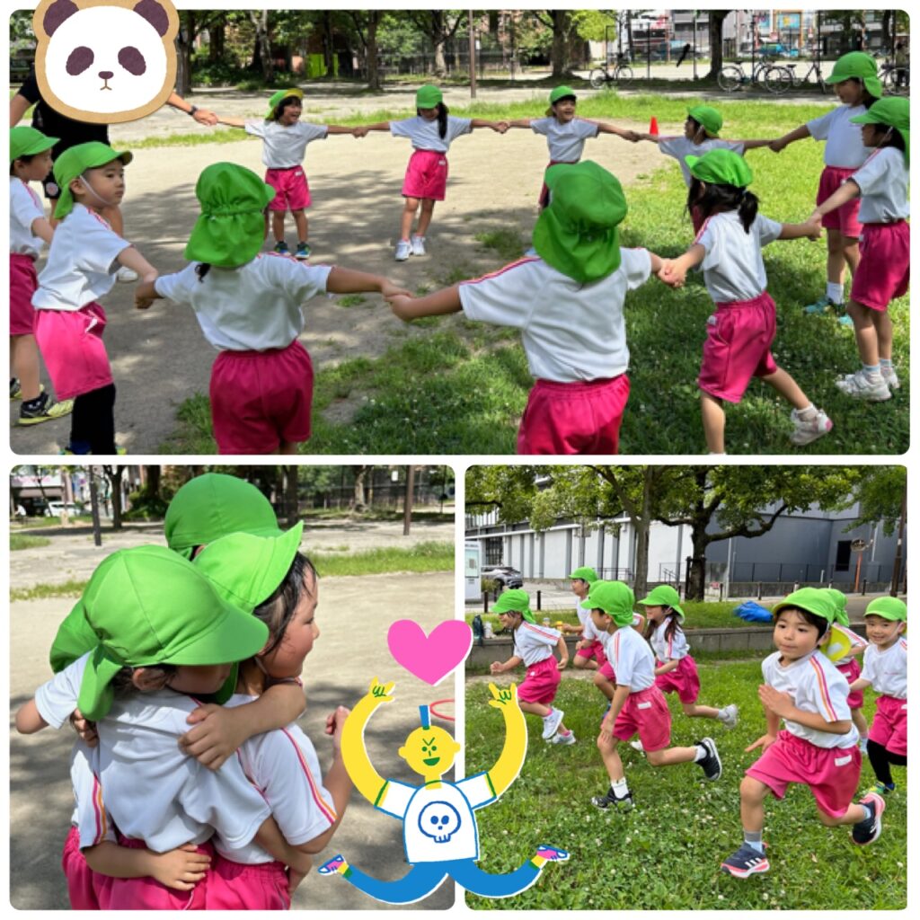 お友だちと一緒に手を繋いで輪っかを作ったり、フープの中に入ったり笑顔いっぱい楽しみました。