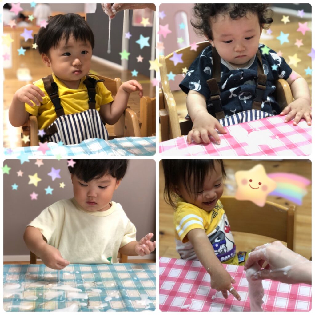子ども達はとても不思議そうに眺めたり、触ったり、感触遊びを楽しみました。