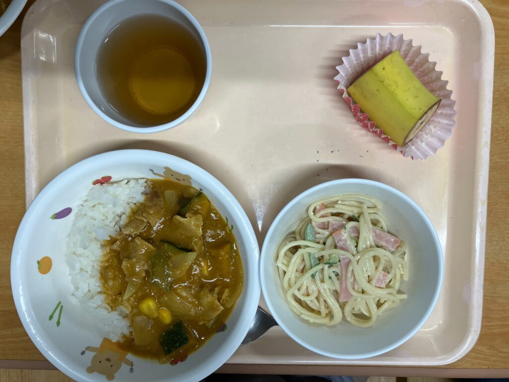 ご飯、夏野菜カレー、スパゲティサラダ、バナナ