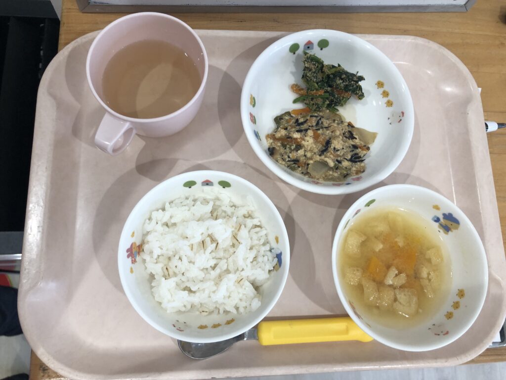 麦ご飯、みそ汁、炒り豆腐(ツナひじき)