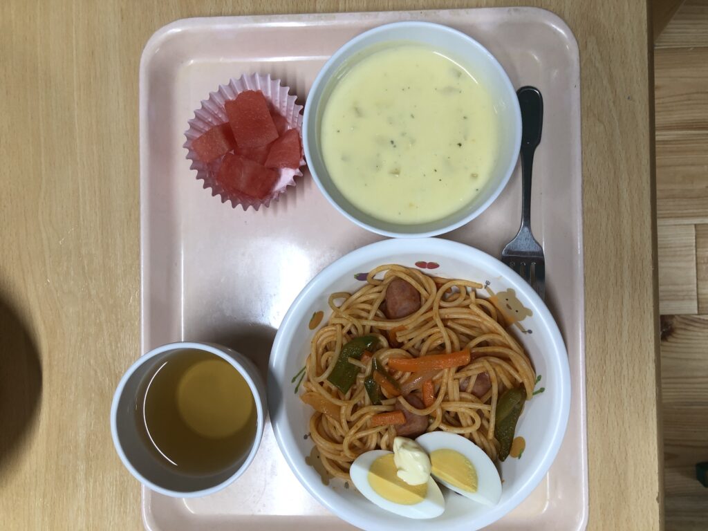 スパゲティナポリタン ゆでたまご コーンクリームスープ すいか