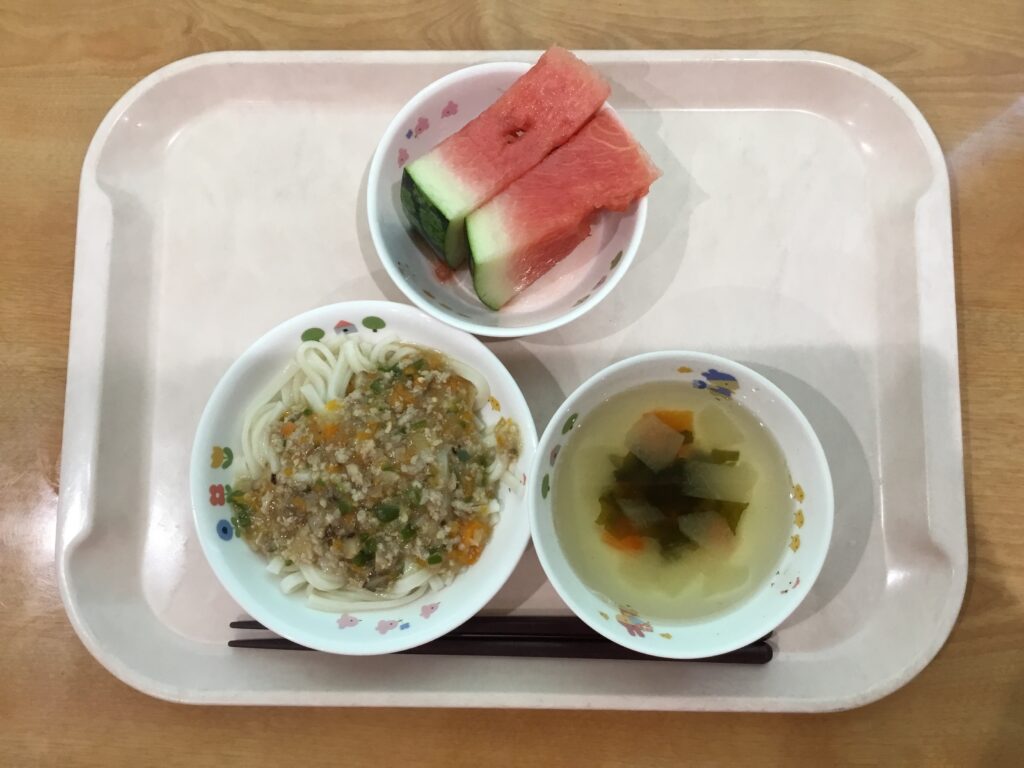 肉みそうどん、すまし汁、スイカ