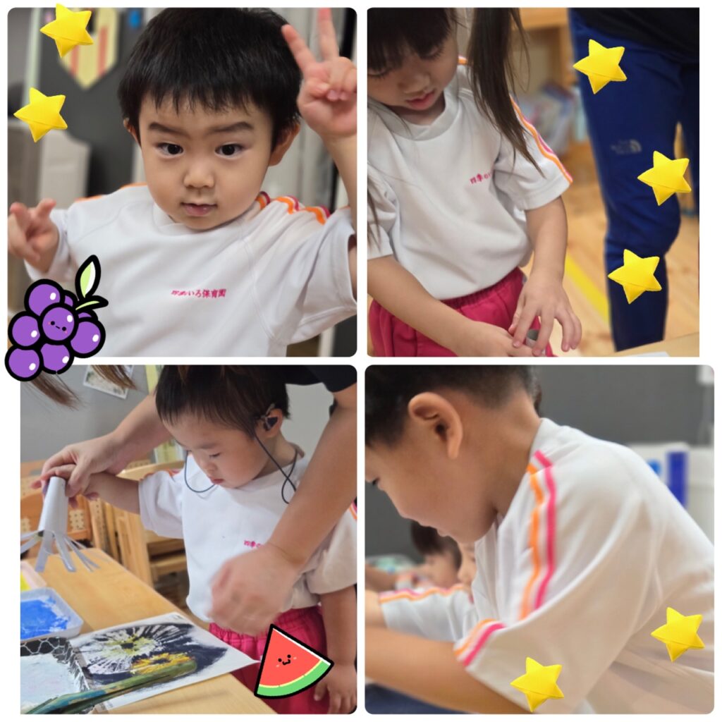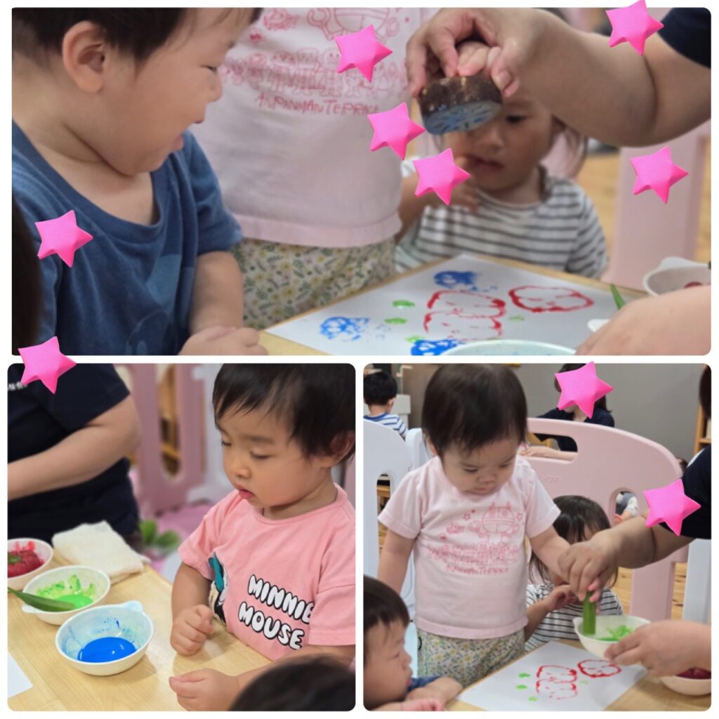 りすぐみ、ねずみぐみさんは夏野菜を使ってスタンプ制作をしました。どんな野菜か先生からお話を聞いて自分の順番がくるまでワクワクしながら待ってる姿もかわいかったです。
