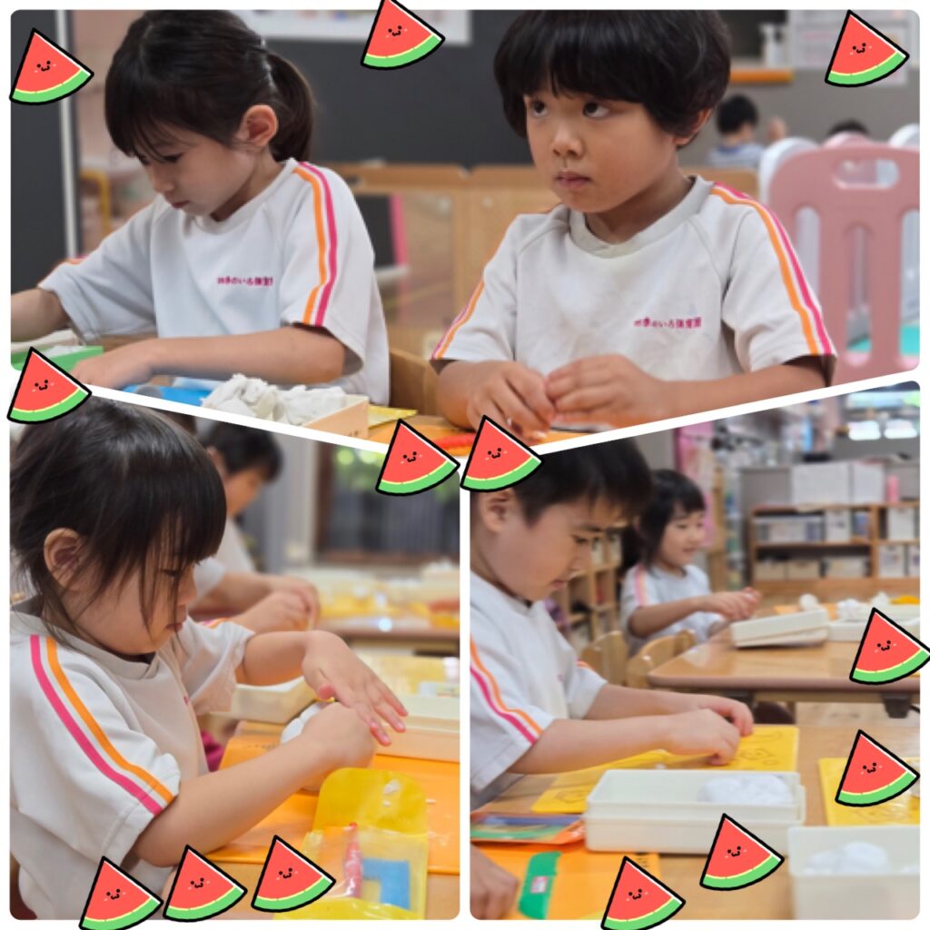 ぱんだぐみ、ぞうぐみさんは粘土制作をしました。好きな形を作っていました。出来上がると手を挙げて先生に発表していました。手を挙げて発表することは少し恥ずかしいお友達もいましたが、先生にはちゃんと伝わっていましたよ。