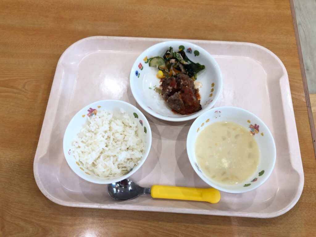 麦ごはん、コーンスープ、ハンバーグ、海藻サラダ