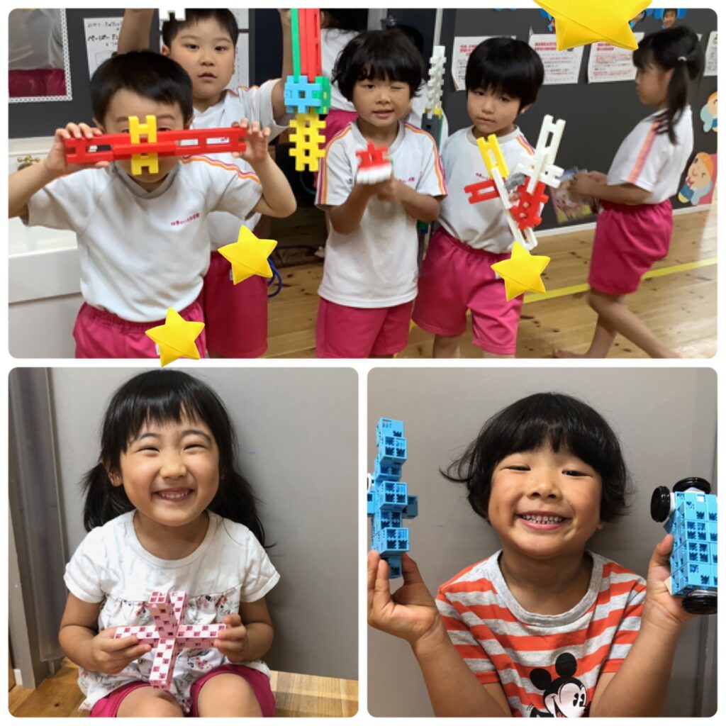 毎日いろんなおもちゃで遊ぶのですが、井形ブロック遊びをしました。いろんな形を組み合わせて剣を作ったり、自動車を作ったり、ロボットを作ったり創造しながら楽しんでいます。