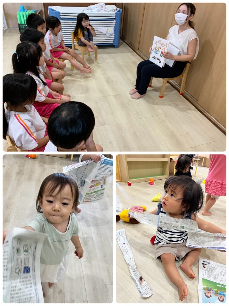 小さな園児たちは新聞をビリビリ、お掃除のお手伝いかな?