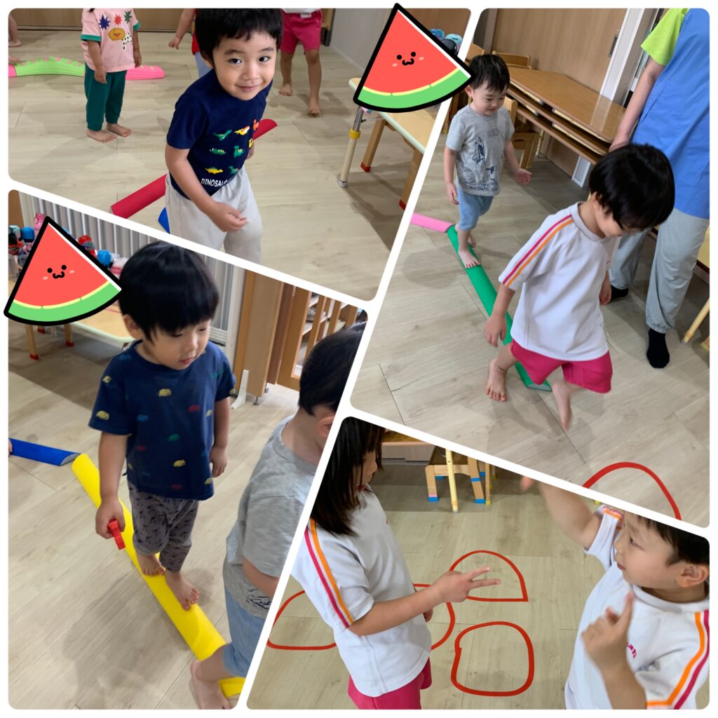 ダンスの後は、平均台で遊んだり、床にテープで貼っている通りケンケンッパ!じゃんけんポン!の