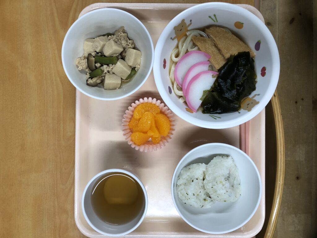 ・青菜ご飯・きつねわかめうどん・高野豆腐のそぼろ煮・みかん缶詰