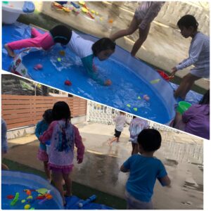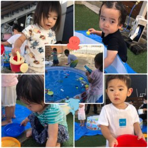 じょうろを使って遊んだり、プールに浮かぶおもちゃを拾ったり(*^^*)
