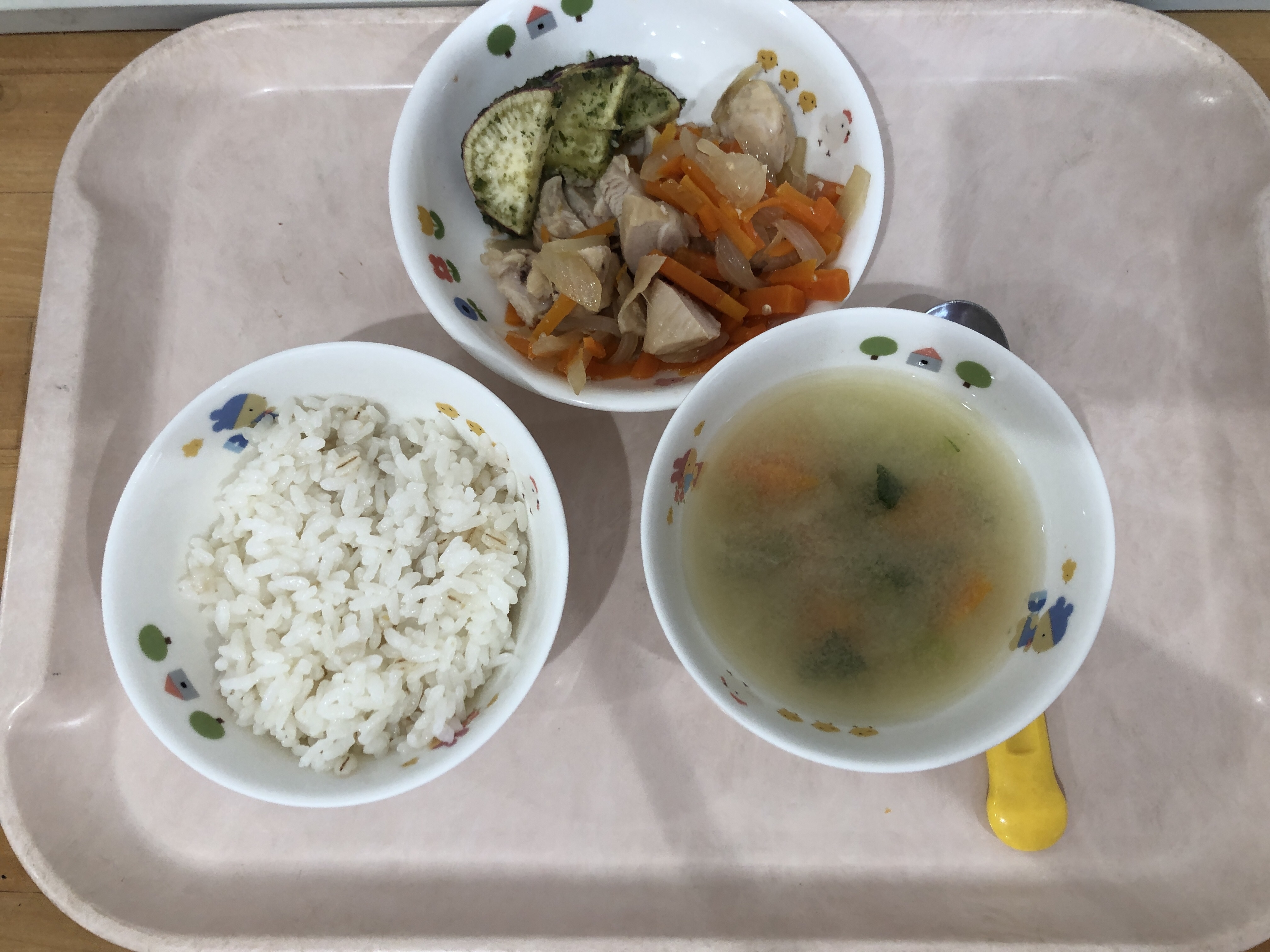 麦ごはん、味噌汁、鶏肉のさっぱり煮、磯辺さつまいも