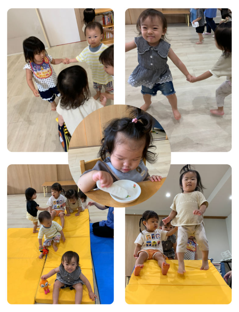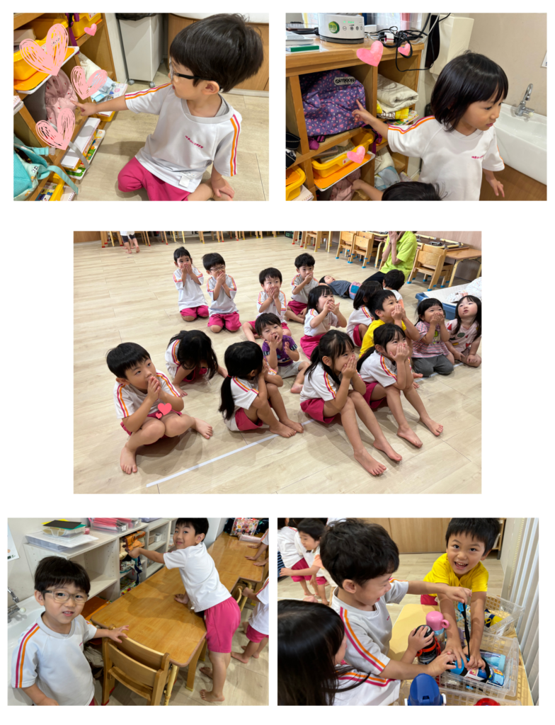 「ピンク!」って言われてハート型の模様や水筒のフタに飛びついていましたが、よく見るとみんなのズボンがピンク~!