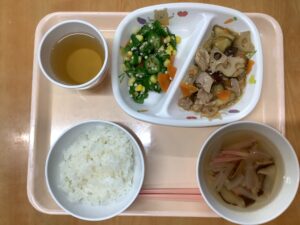 ご飯、鶏肉とレンコンの甘酢炒め、オクラとコーンの和え物、かまぼこと玉ねぎのすまし汁