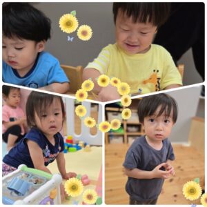 室内ではお絵かきボードに絵を描いて遊びました。「まるかいて~」と言いながら大きなまるを描くことができていました。ニコニコ笑顔😊でかわいいです。