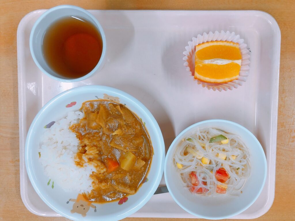 ご飯、ポークカレー、春雨のナムル、オレンジ