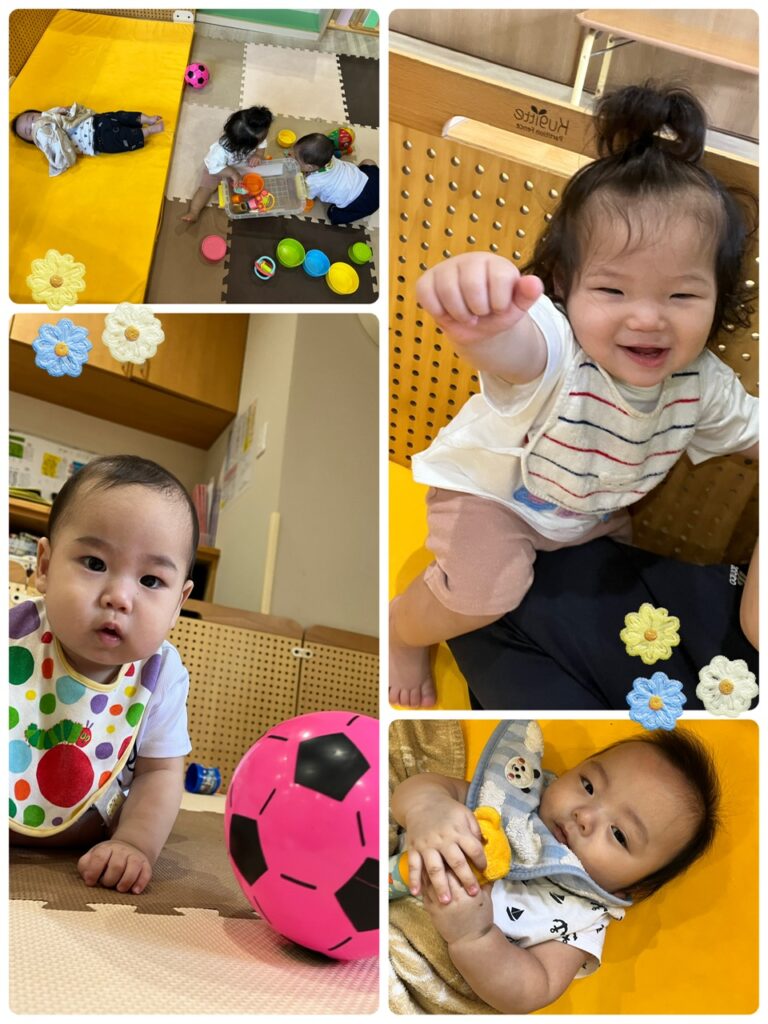 おひさま組さんは、小さなボールや音が鳴るおもちゃでゆったりと遊びました!!