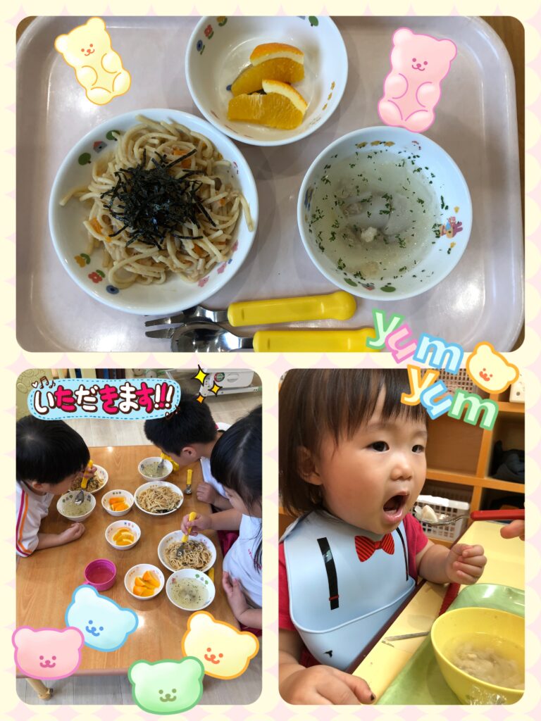 ツナとしめじの和風スパゲッティ、野菜スープ、オレンジ