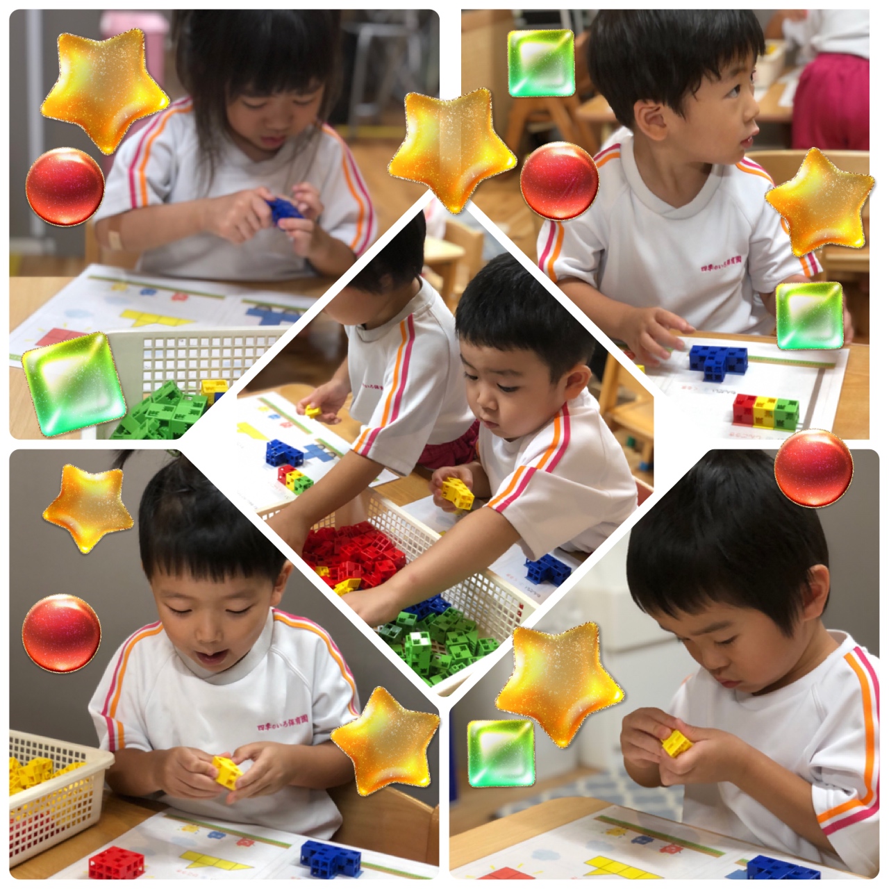 「これいる?」とブロックを差し出して渡す姿も見られ、成長を感じました。くま組のお友達はプログラミング教室で知育ブロックをとても集中して行っていました!