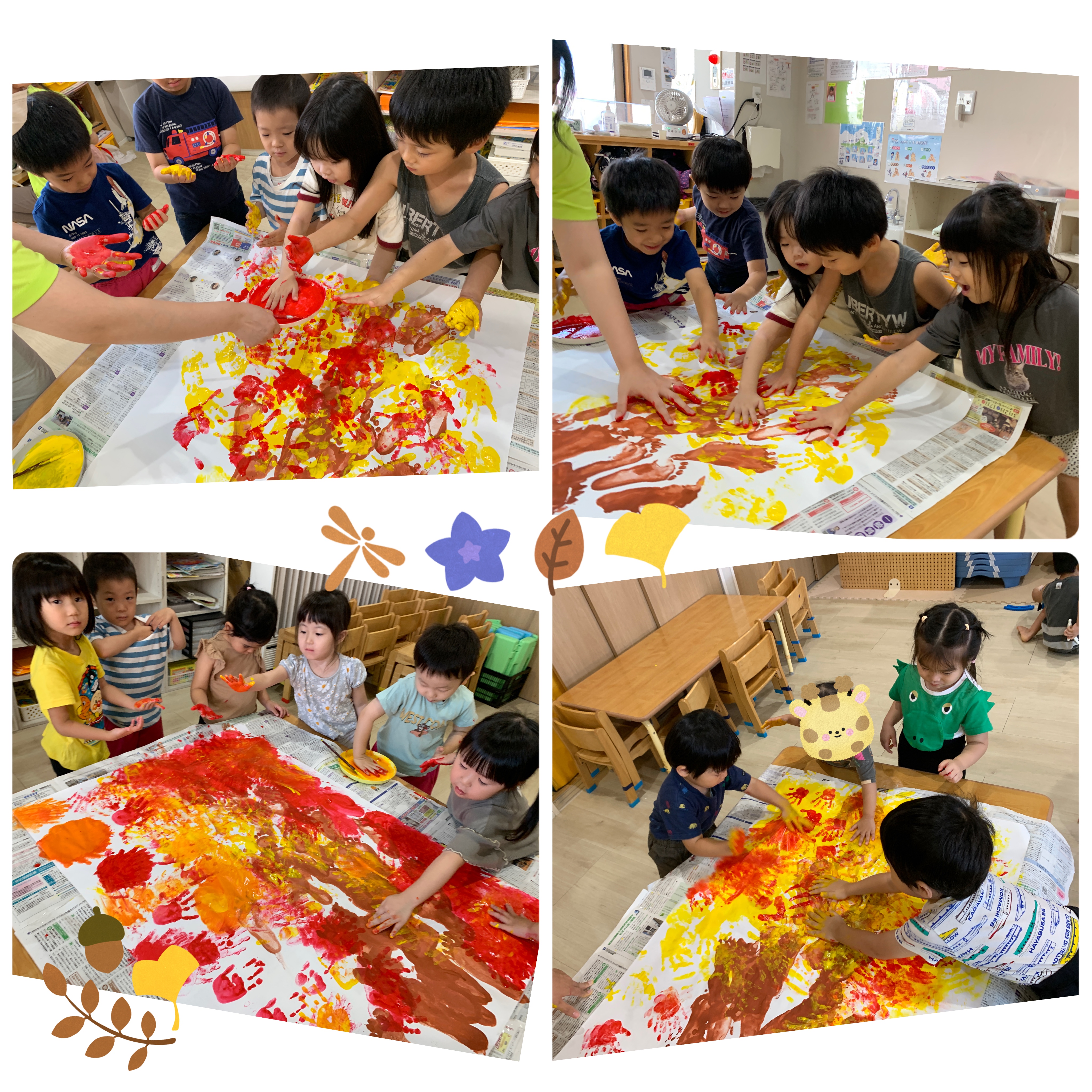 この間足形で描いた木の幹に、秋らしい真っ赤な色で葉っぱをぺたぺたしていきました!