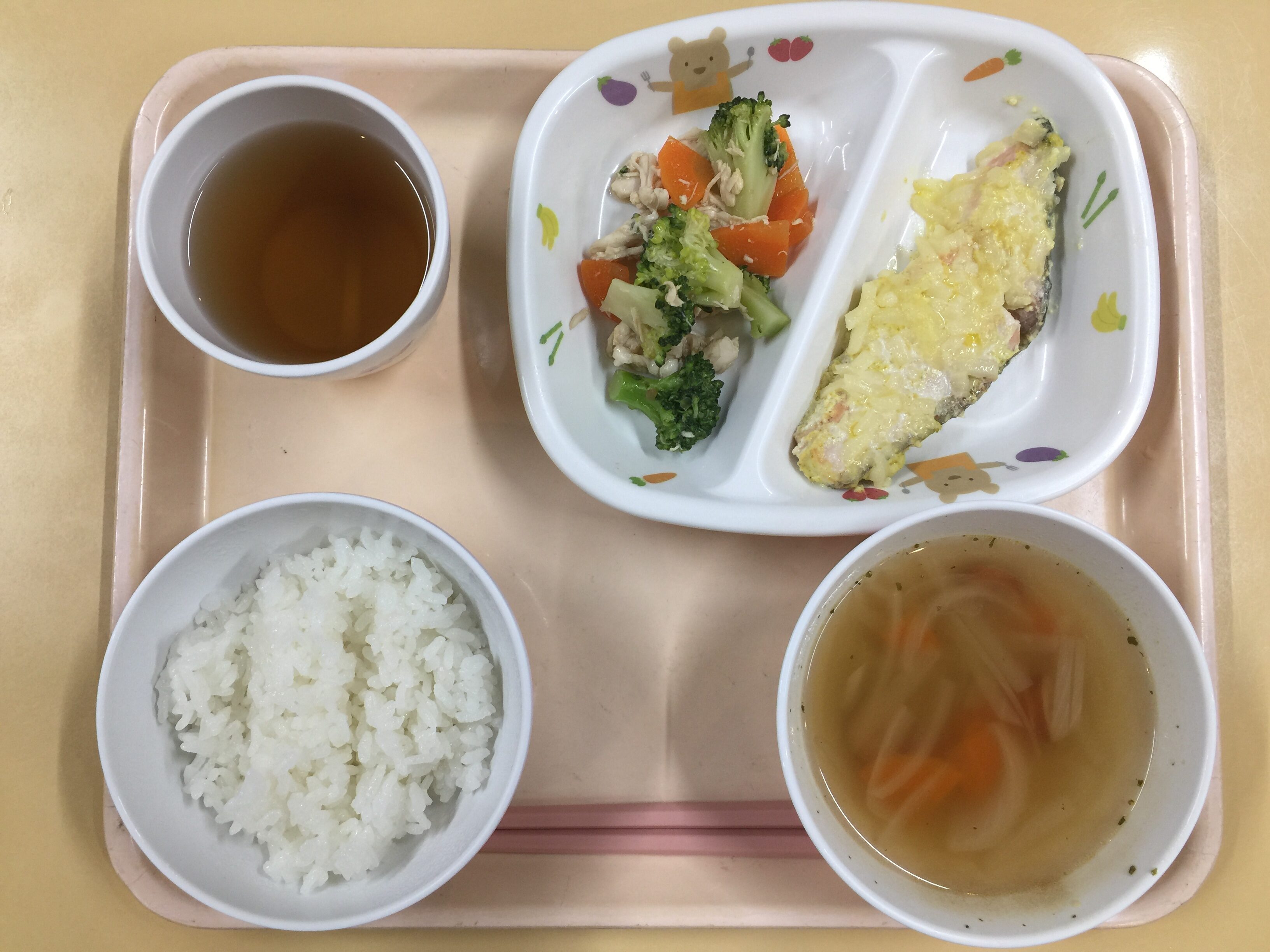 ご飯、鮭のカレーマヨ焼、ブロッコリーサラダ、ウインナ―のコンソメスープ
