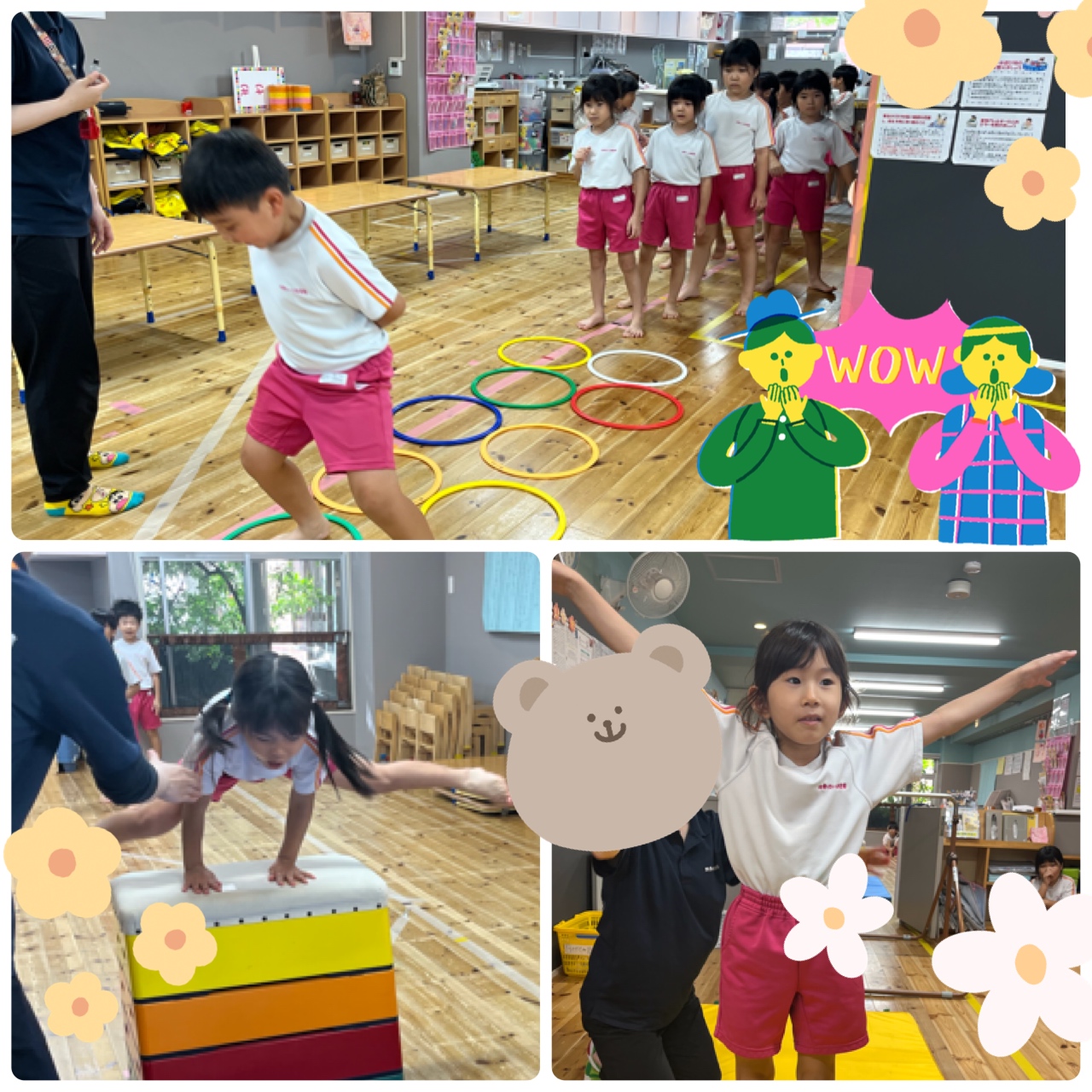 ぱんだ組さん、ぞう組さんはフープや跳び箱で身体を動かしました。