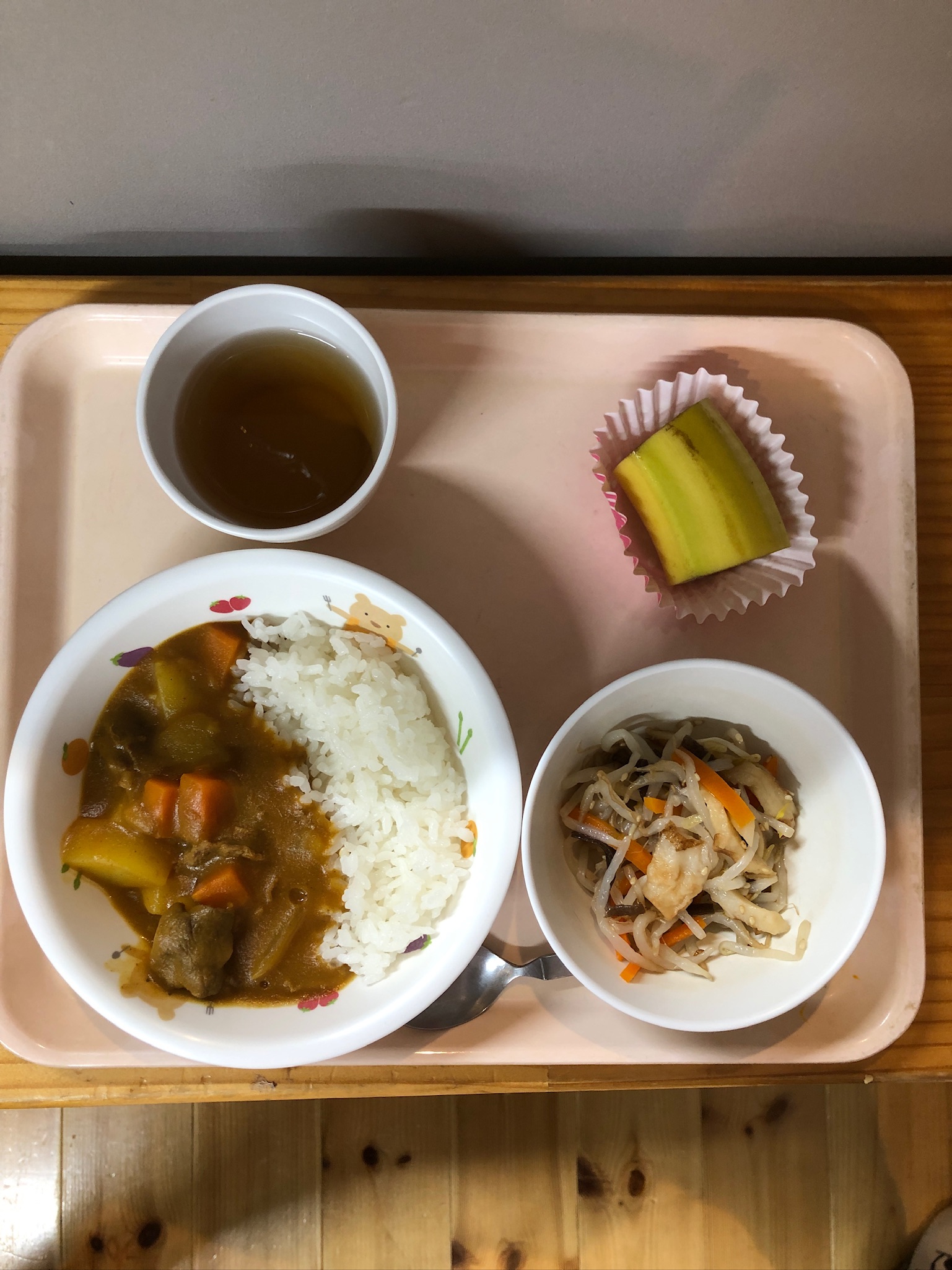 ご飯、ビーフカレー、もやしのナムル、バナナ