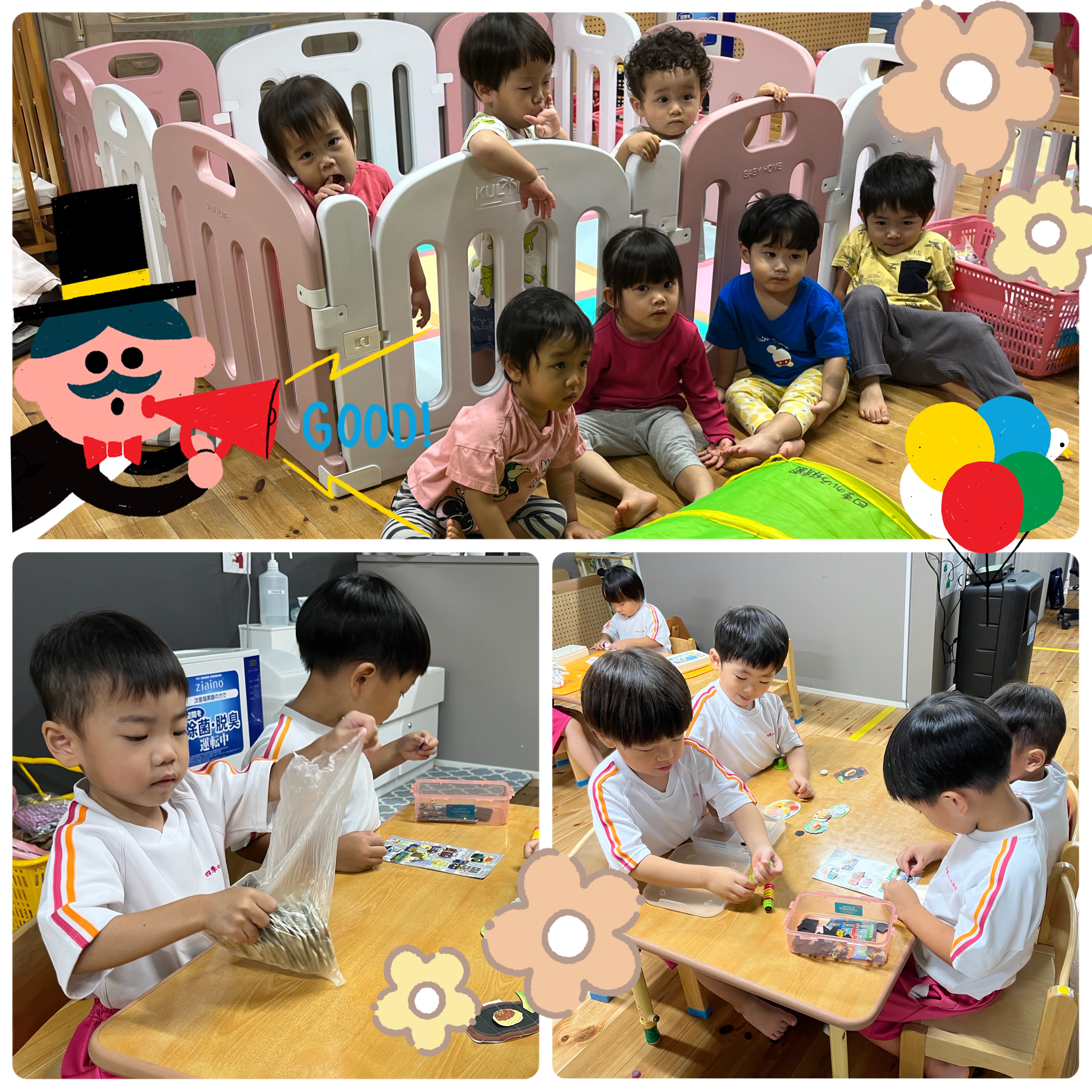 ぐらぐらする~とお友だちと笑いあったり、ブリッジは先生に手伝ってもらってさかさまだ~と楽しく運動をしました!