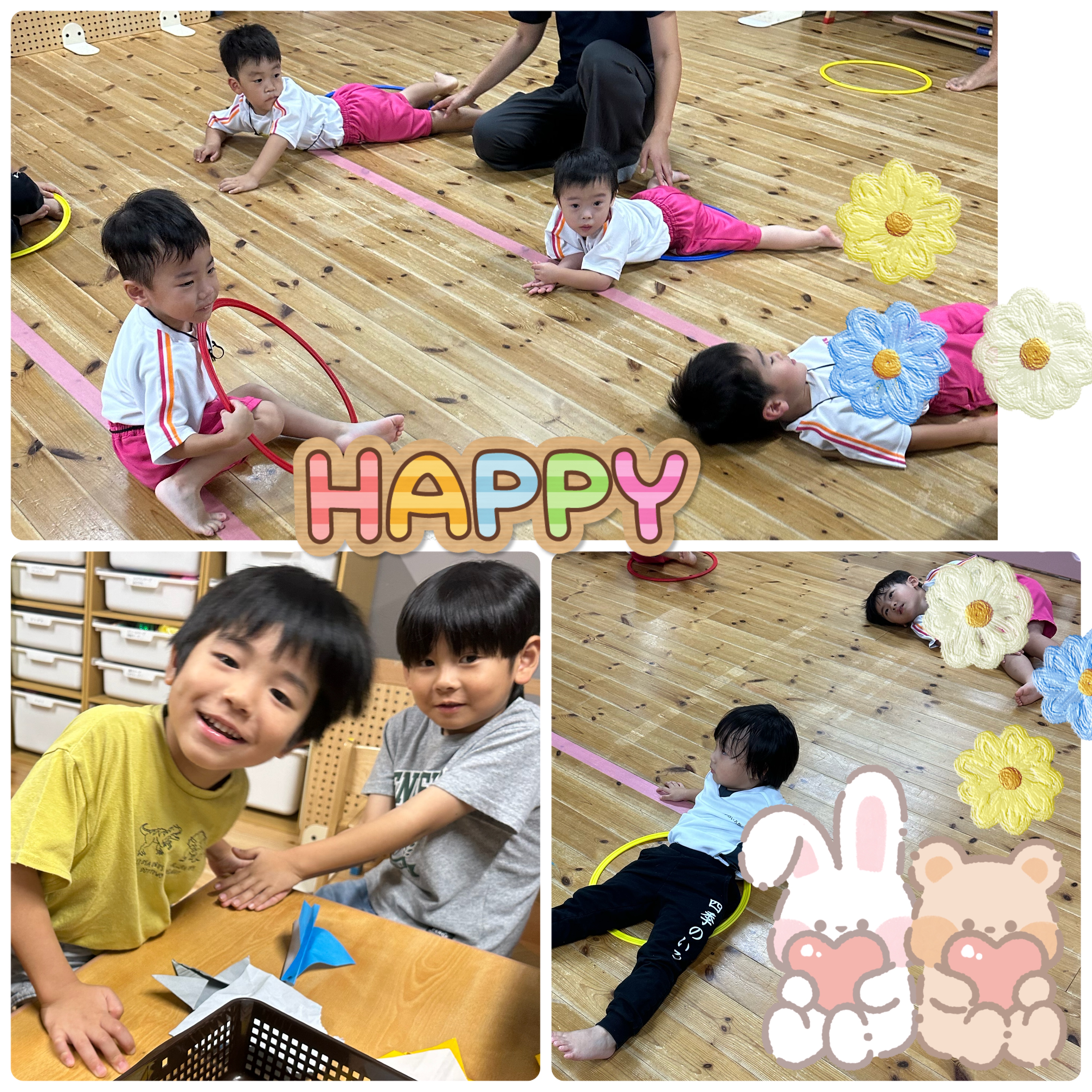 うさぎ組さん、ぱんだ組さん、ぞう組さんはコーディネーション運動を行いました。フープを使って、身体をくぐらせたり、フープの上に転がったり笑顔いっぱい!