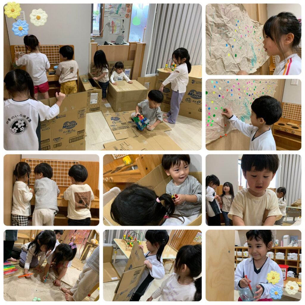 みんなでダンボール遊びをしましたよ。集中して何かを作っていたお友達。何を作っているのか見てみるとお家を作っていました🏠