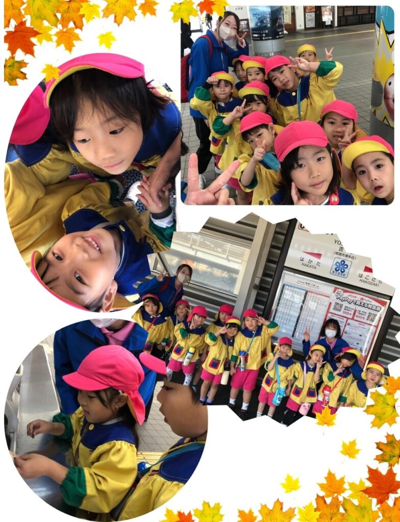 それぞれ切符を買って、改札に入って、エスカレーターを上がり、電車に乗って筥崎宮へ🌞