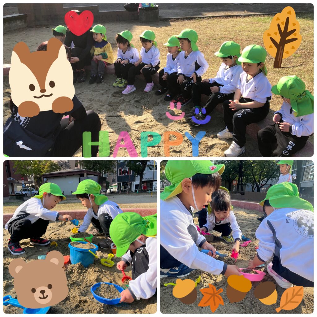 スコップを上手に使ってバケツをお砂いっぱいにしてみたり、お山を作ったり、落ち葉を観察したり、たくさん遊んで園に帰ってきてくれました☺