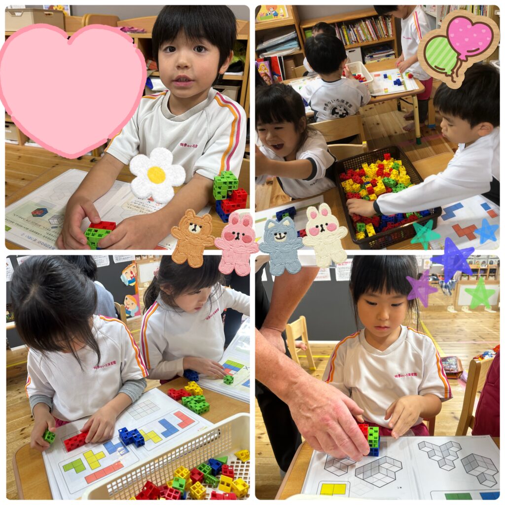 ぱんだ組ぞう組さんはプログラミング教室があったので、先生と一緒にブロックを使ったかたち合わせパズルをしました。