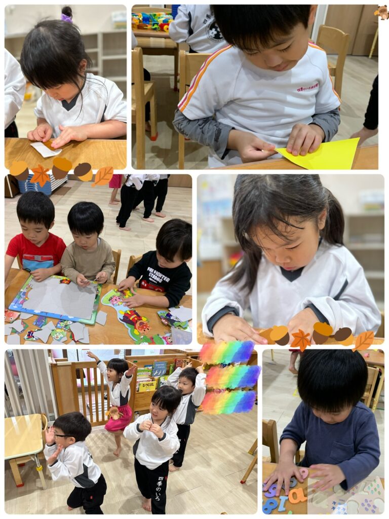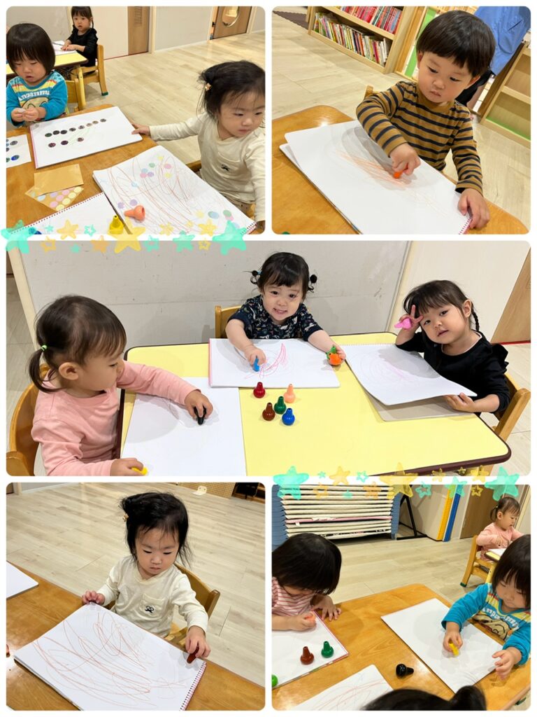 未満児さんは、ブロックやお絵描き、シール貼りなどをしてゆったりと遊びましたよ★彡好きな色を選びながら、お友達や先生と楽しく遊びましたよ。