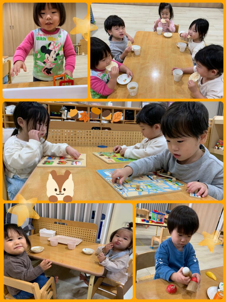 未満児さんは、みんなでおやつを食べた後、ダンスやスカーフを使って身体を動かしたり、パズルをして遊びました♬