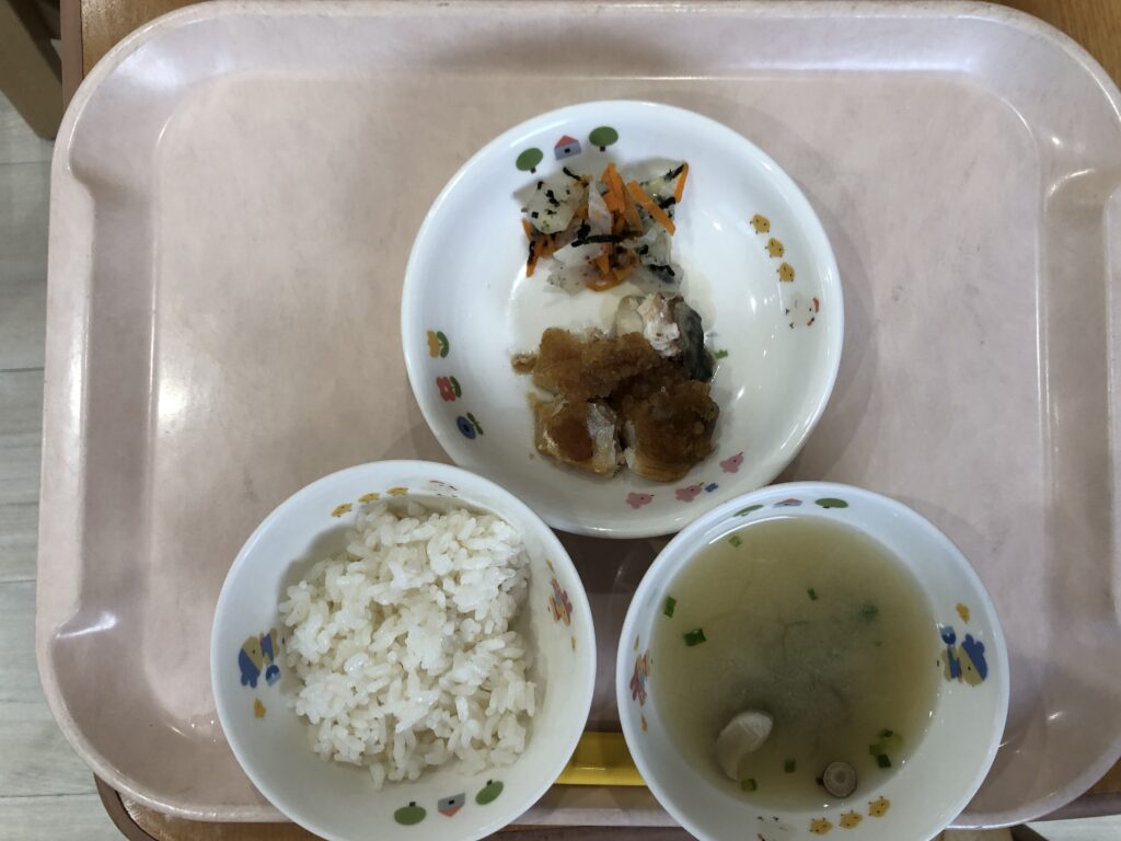 麦ごはん、みそ汁、さばのおろし煮、きゃべつのあえ