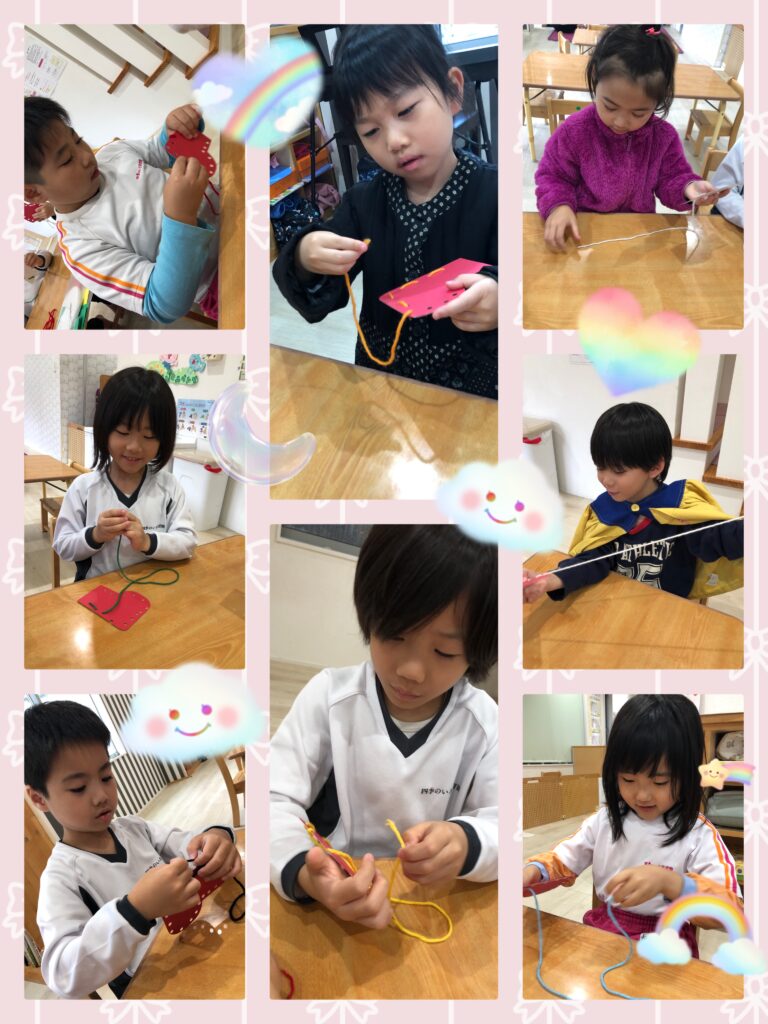 以上児さんは、毛糸を使って製作をしました。みんな集中して取り組んでいましたよ!