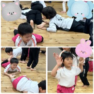 先生のピアノに合わせて身体を動かすリトミックもしましたよ。上手に動物に変身したり、大きな風船になってパチンっと割れてみたりと、とっても楽しく身体を動かしました。