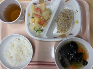 〇普通食:ごはん、鶏肉の香草焼き、コーンクリーミーサラダ、ウインナーのコンソメスープ